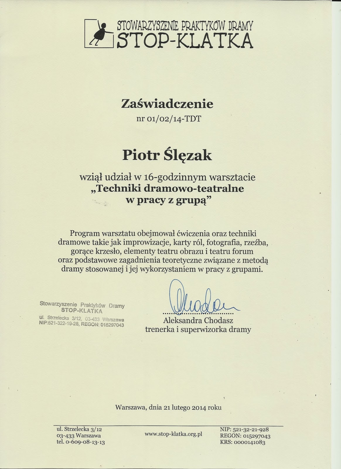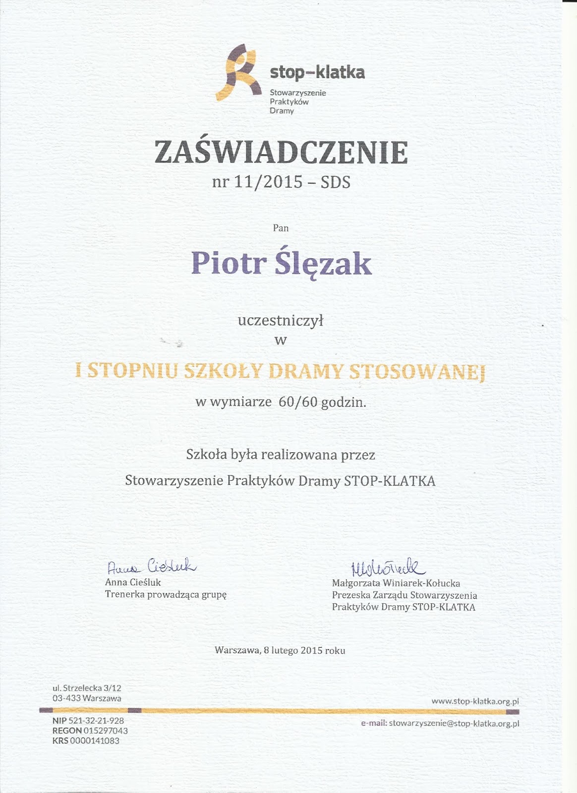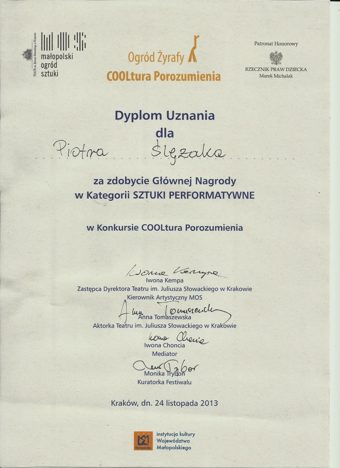Grand Prix w konkursie COOLtura Porozumienia w kategorii Sztuki Performatywne za spektakl „DZIECI KOWALSKICH” oraz nagroda za reżyserię.